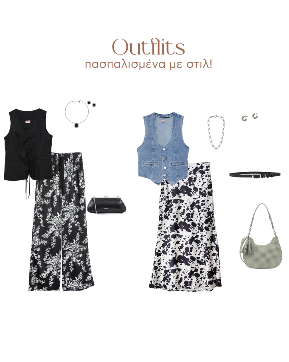 Δημιουργείς σύνολα που λειτουργούν αρμονικά από το πρωί έως το βράδυ. Τα κομμάτια συνδυάζονται εύκολα, διατηρώντας ισορροπία και ευελιξία σε κάθε περίσταση. Οι σατινέ υφές σε συνδυασμό με floral και animal print patterns σε βάζουν σε mood άνοιξης. Το γιλέκο φορεμένο σαν τοπ είναι η πιο εύκολη και stylish προσθήκη στο look. Τσάντα ματ ή με υφές και διακοσμητικές λεπτομέρειες; Όλες οι επιλογές είναι σωστές καθώς και οι τελευταίες πινελιές όπως ένα κόσμημα ή μία ζώνη.
